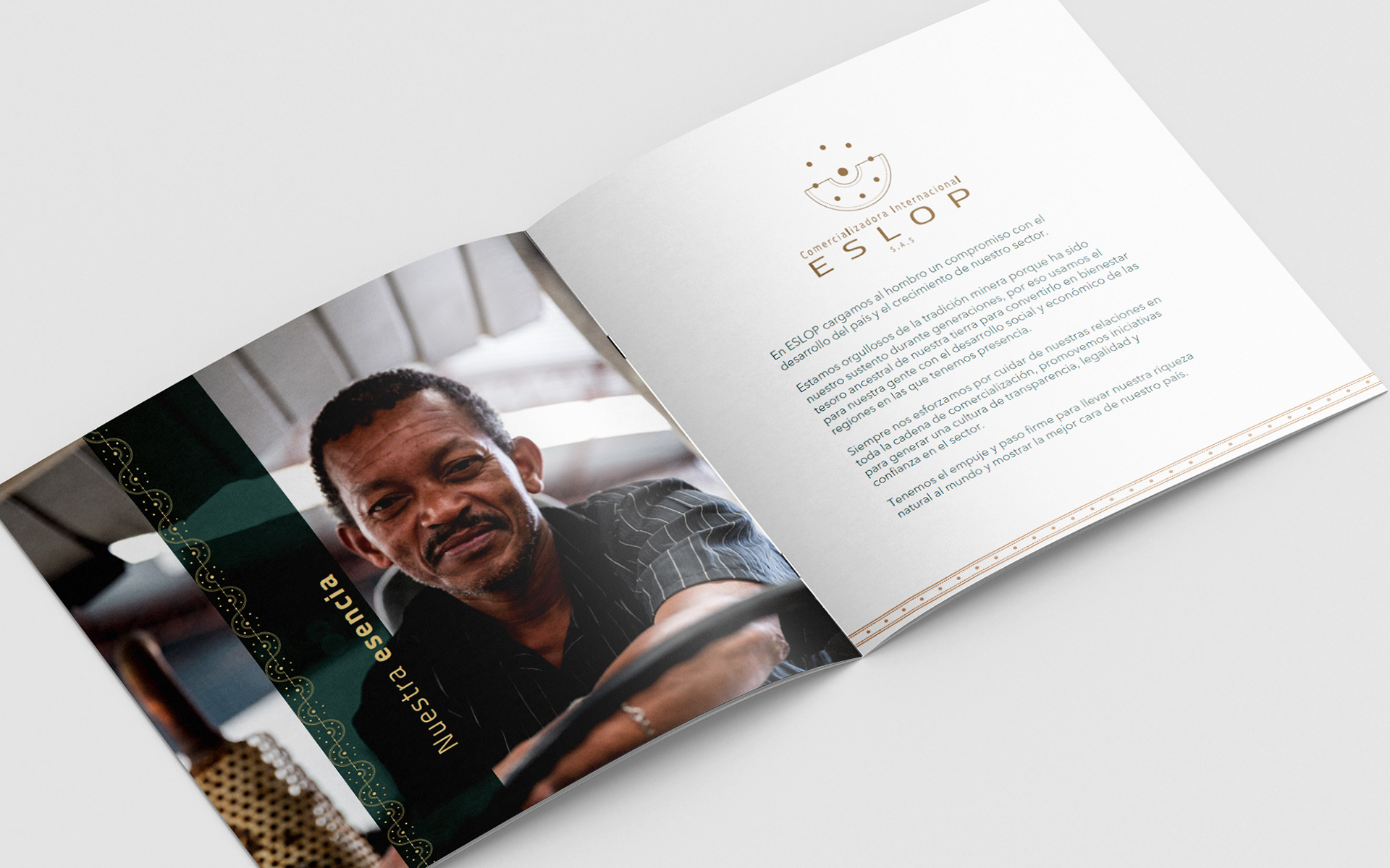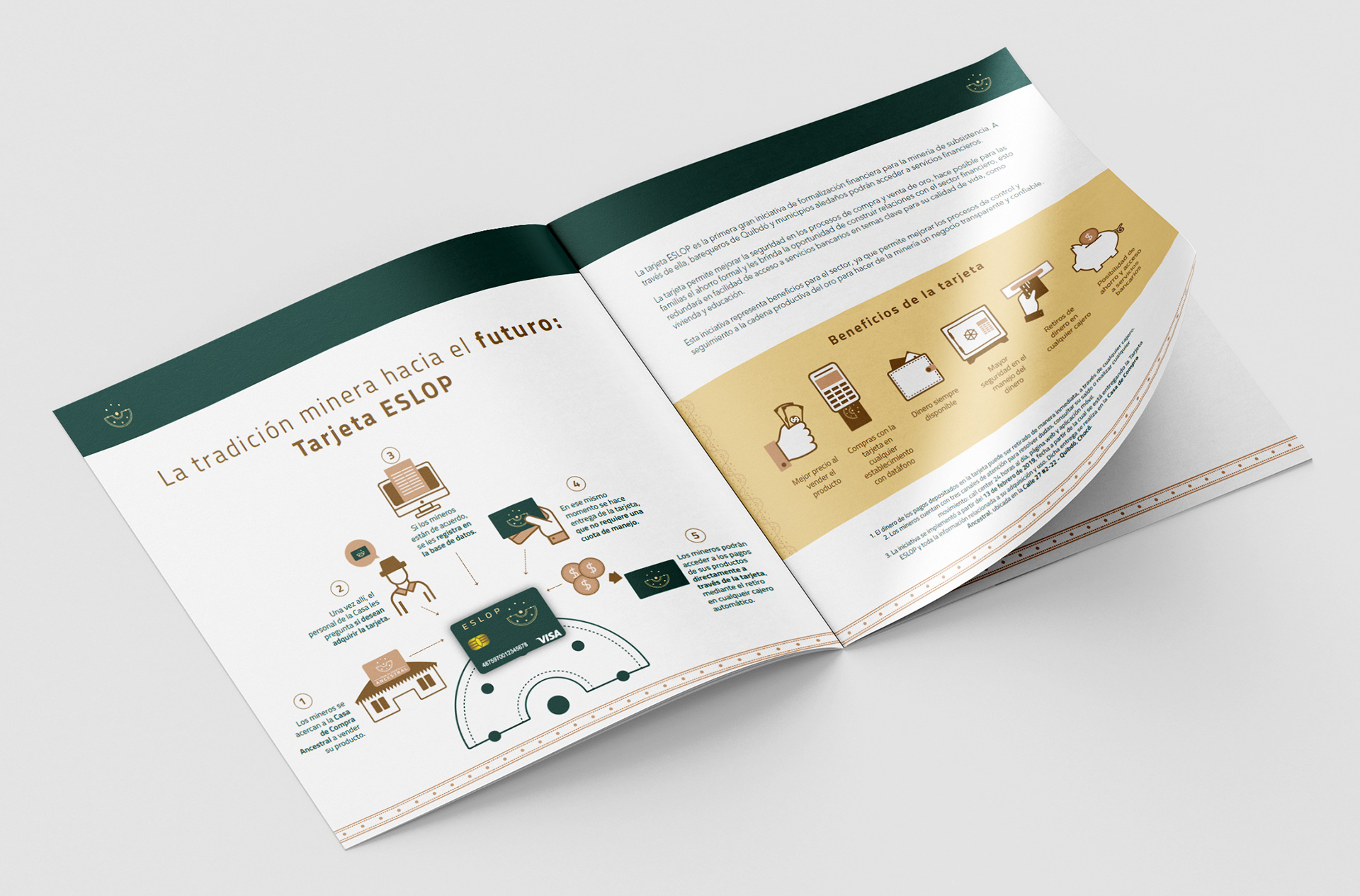 This gold commercialization company sought to communicate its social and environmental responsibility to clients and other stakeholders, as illegal mining is a significant issue in many regions of Colombia. On the other hand, ESLOP aimed to inform miners about financial products that would be convenient for them when joining their commercialization chain. This brochure features infographics and full-page, engaging images to achieve these goals.
