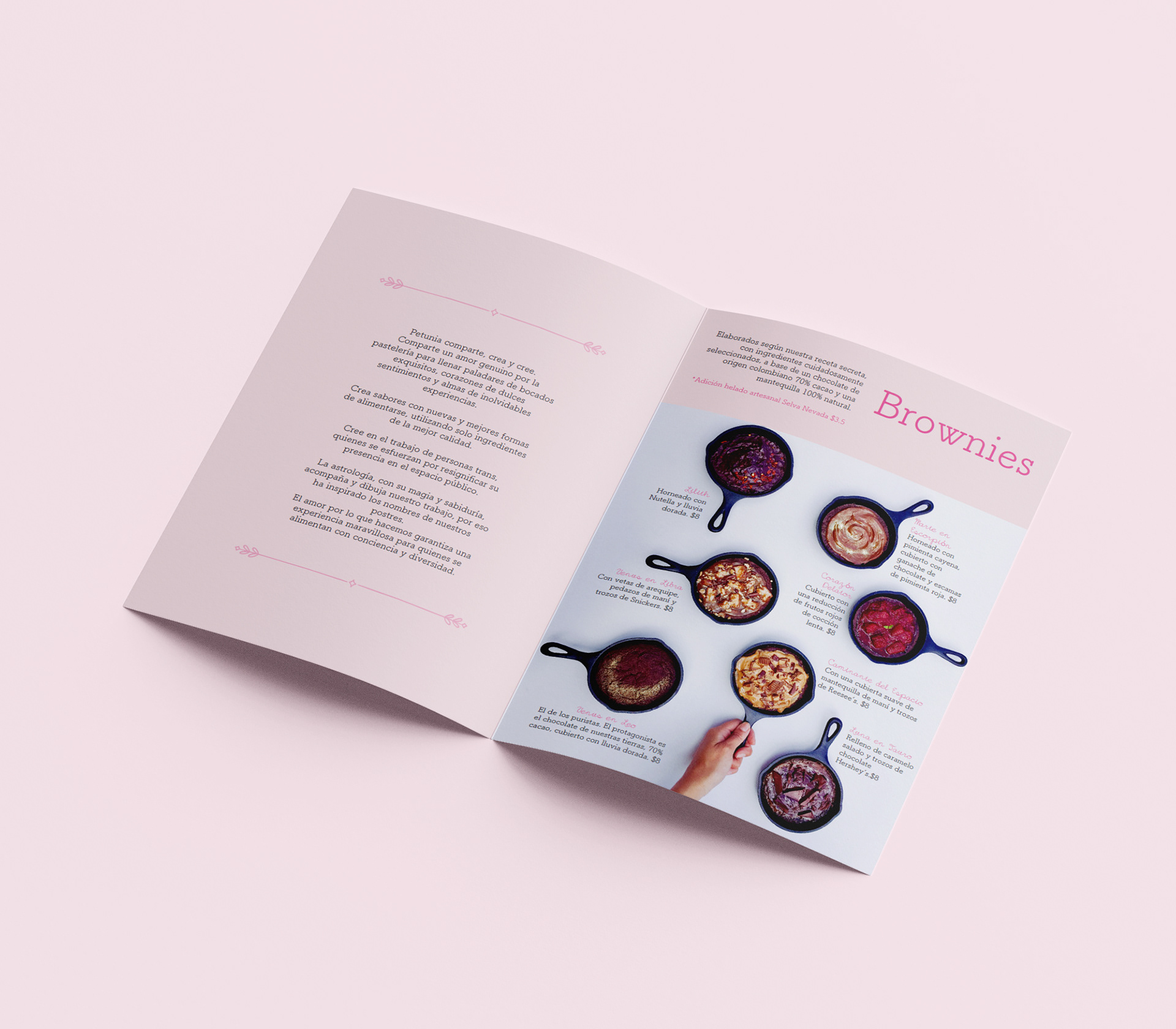 Petunia is a bakery that aims to be close to its clients and, at the same time, communicate its commitment to providing job opportunities to the transgender community. The result of this project is a menu that clients use not only to order products, but also to learn from the "soul-made" bakery they are visiting.