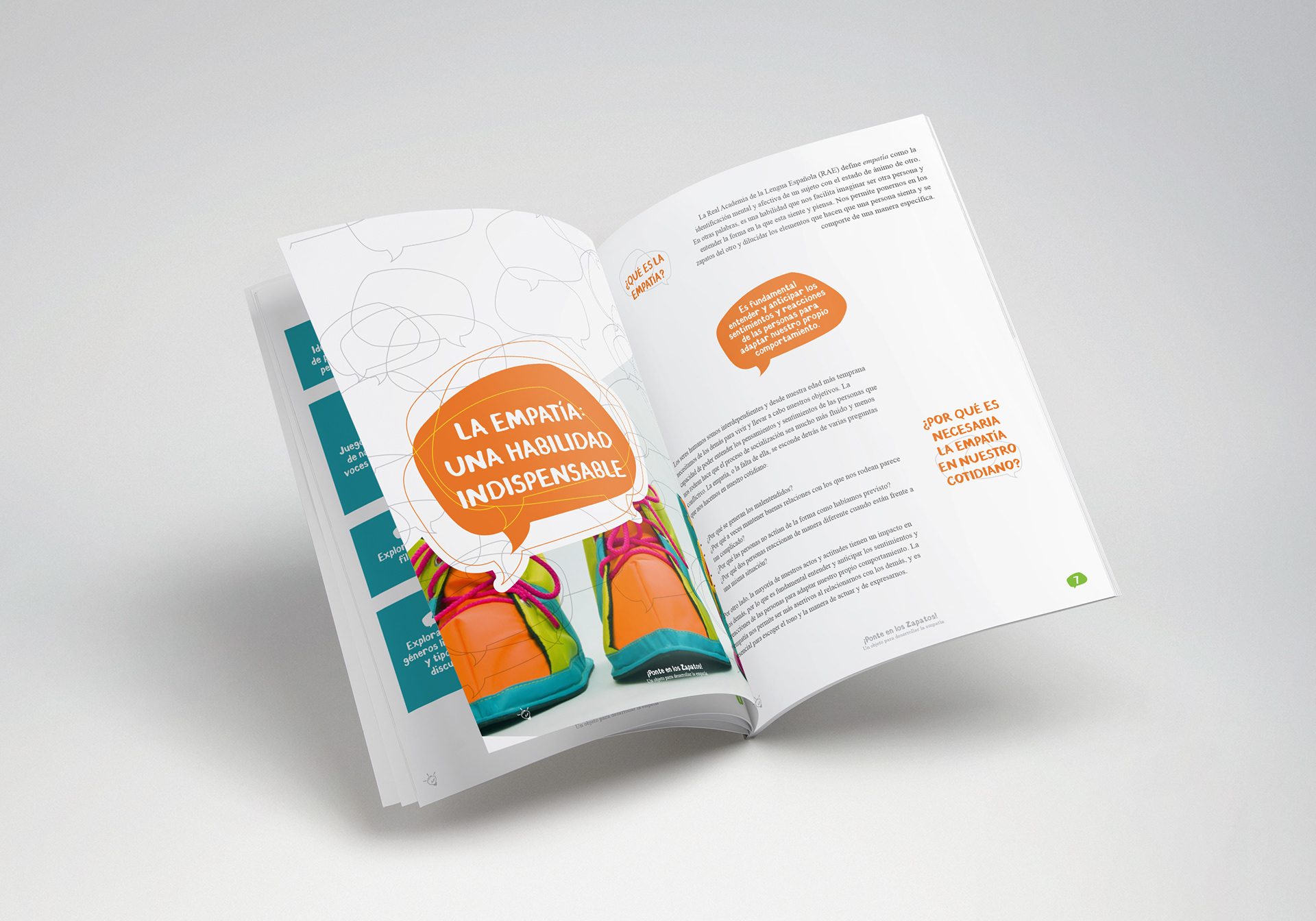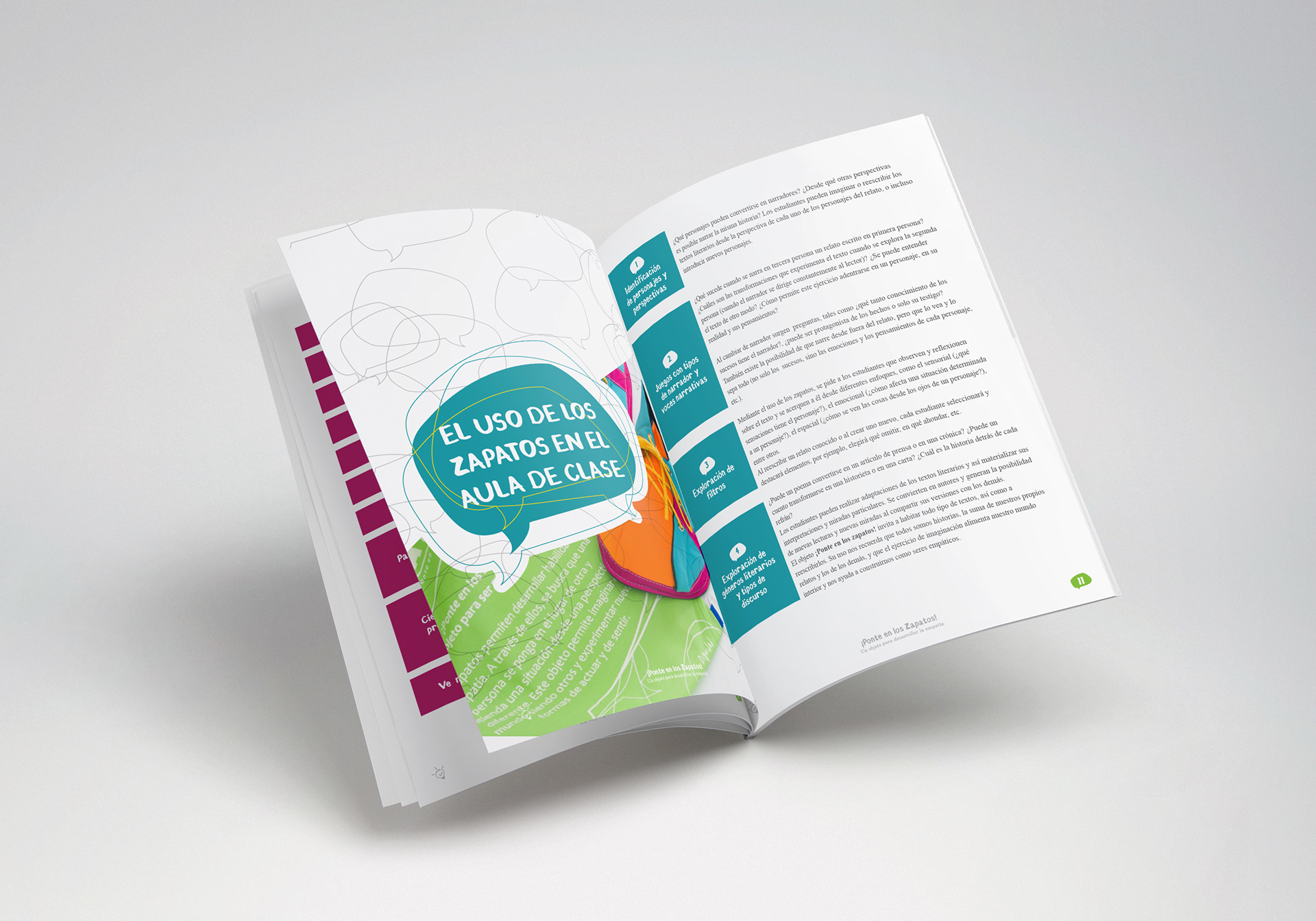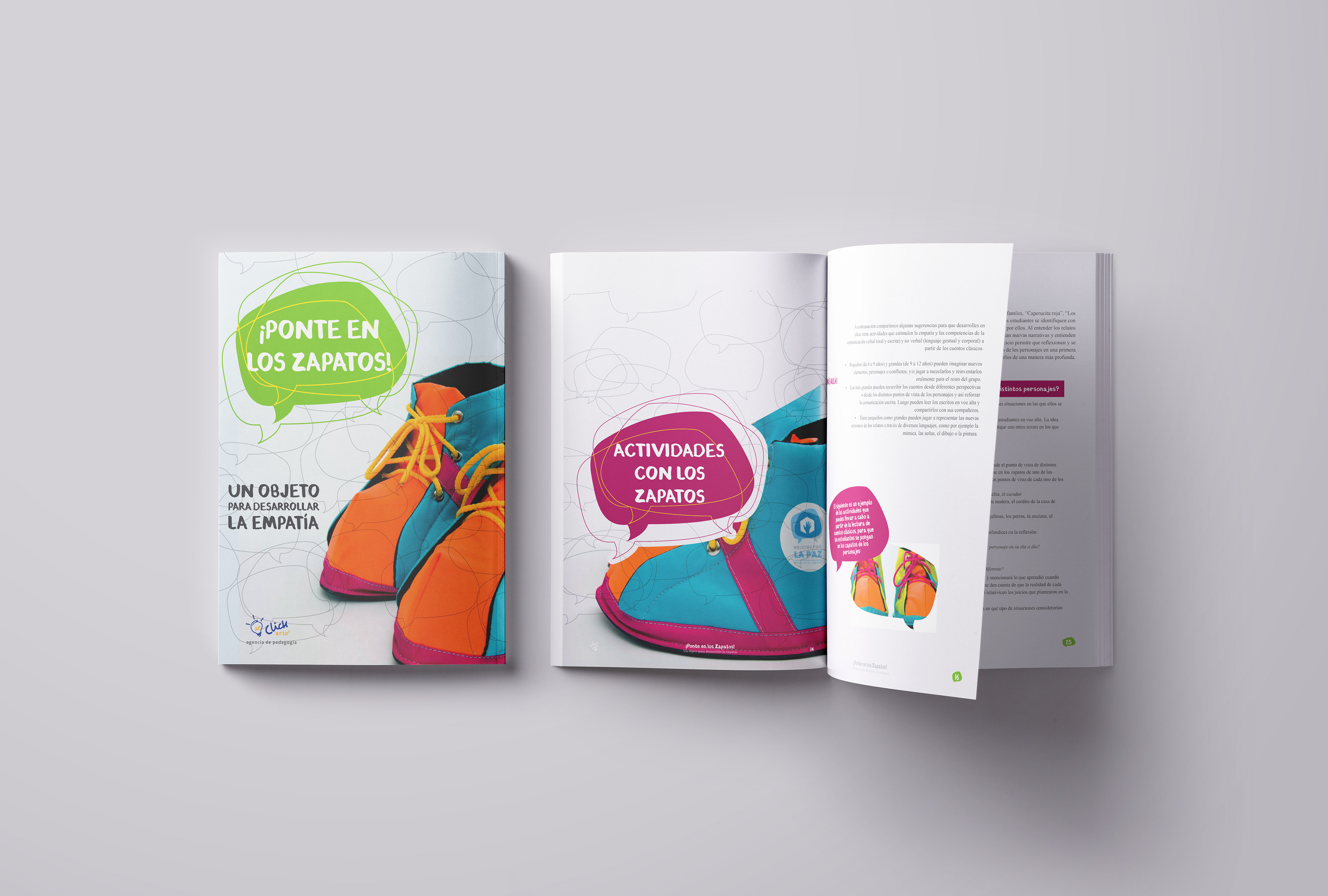 Click Arte's giant shoes were a pedagogical tool for teachers, caregivers, and others to use with children, triggering conversations and exercises about empathy in a context of peacebuilding in Colombia. The user guide layout and information provide comprehensive advice and ideas on maximizing the tool's use.