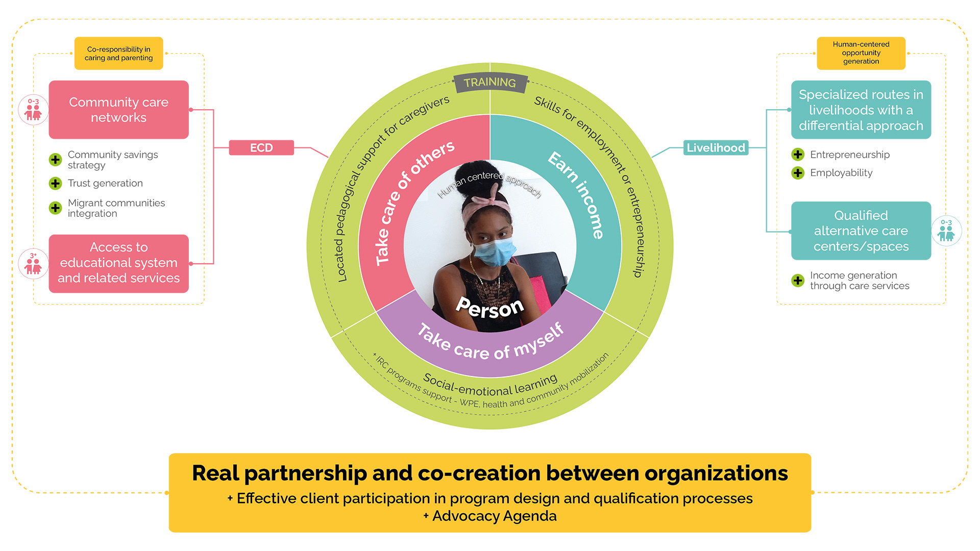 A gender-sensitive 2Gen approach to early childhood development, underpinned by improvements in female caregivers' economic and psychosocial well-being. Rooted in gender sensitivity, this approach is based on an integrated service model that leverages the expertise of trusted and recognized CSOs and female community leaders already working with women and children in the selected locations.